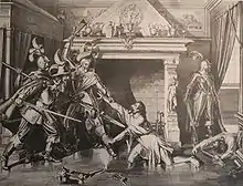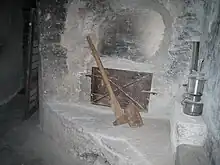 In 1620, Catholic forces attacked and killed between 500[6] and 600[7] Protestants in the Valtellina valley. Around the same time Pompeius Planta returned to Rietburg believing that enough time had passed. However, on 24 February 1621, a force of anti-Habsburg troops led by Jörg Jenatsch assembled to attack the castle in retaliation for the killings in Valtellina. Early in the morning on 25 February, the troops attacked the castle and killed Pompeius Planta as he attempted to flee.[5] According to one version of the story, Pompeius attempted to hide in a chimney, but was discovered by a dog. He was attacked by the raiders and killed by Jenatsch with an axe.[8] Years later, Jenatsch converted to Catholicism and on 24 January 1639, he was killed during Carnival in Chur by an unknown attacker who was dressed as a bear. The attacker may have been a son of Pompeius Planta[6] or an assassin hired by the local aristocracy.[9] According to legend he was killed by the same axe that he used on Pompeius.[8]