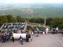 The top station of the Rietburgbahn lies just a few steps away from the castle ruins and a pub, the Höhengaststätte Rietburg has been incorporated into it, which has an open-air terrace with extensive views over the Rhine Plain. From here the whole Bergstraße Route may be seen across the plain from Melibokus in the north to the Königstuhl near Heidelberg. The view continues to Steinsberg near Sinsheim, the highest point of the Kraichgau region; and in clear visibility the Heuchelberg and Stromberg may be seen. To the southeast is the Northern Black Forest from the Badener Höhe via the Mehliskopf to the Hornisgrinde. In exceptionally clear weather, the tall houses of Frankfurt (Westendstraße 1) may be seen to the far north-northeast, to the east Katzenbuckel (immediately left of the Königstuhl) and to the south-southeast, the Central Black Forest as far as Kenzingen, where the Black Forest descends eastwards into the Freiburg Bay.