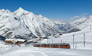 Riffelberg is a railway station on the Gornergrat railway, a rack railway which links the resort of Zermatt with the summit of the Gornergrat. The station is situated west of the Gornergrat, in the Swiss municipality of Zermatt and canton of Valais, at an altitude of 2,582 m (8,471 ft) above mean sea level.[1][2][3] It is the third highest station on the line and, considering only open-air railway stations, the third highest in Switzerland and Europe as well.