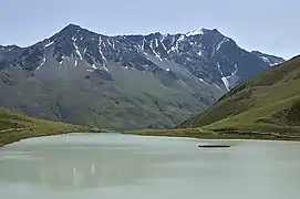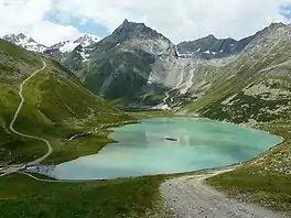 Rifflsee is a lake of Tyrol, Austria.[2] It is the largest lake in the Ötztal Alps. The mountain lake is located in the Kaunergrat west of the Pitztal and is a typical moraine reservoir. The lake fills an extensive valley, the glacier-turbid water looks greenish. It is framed in the north and west by rugged peaks of the Kaunergrat, particularly striking are Seekogel and Rostizkogel. In sunny and warm weather, a considerable amount of melt water is supplied by the Seekarles, Loch, and Rifflferner.