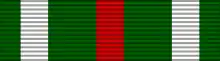 The ribbon bar of the order is dark green with two white bands on the sides and a red band in the middle. The same ribbon is used in the flag of the Riflemen's Union.