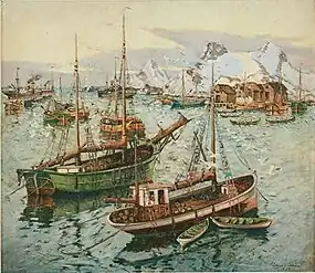 His father, Albert Esaias Lindström, was a composer and organist.[1] After receiving some free lessons from Caleb Althin, he began his formal studies in 1901, at the Royal Swedish Academy of Fine Arts. From 1902 to 1905, he studied with Kristian Zahrtmann in Copenhagen.[2] He also took several study trips to Paris. Since he was a boy, he had been interested in nautical subjects, and even served some time as a "Royal Mail Sailor".[1] As an adult, he roamed along the Scandinavian coast and seascapes came to dominate his output. He was especially fond of Åland and Lofoten, and often depicted sailing ships.[3]