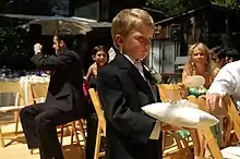 In a formal wedding, the ring bearer is a special page who carries the wedding rings for the bridal party. This is almost always symbolic, with the ring bearer carrying a wedding ring cushion on which imitation rings are sewn, while the real wedding bands are kept in the safekeeping of the best man. If the real rings are used, they are generally tacked on with thread to prevent their accidental loss.