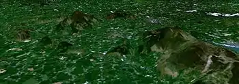 Added to this complex interaction of pre-volcanic and volcanic activity,[11] the area was subject to the action of glaciers during successive Ice Ages. Deep valleys were formed as glaciers exploited weaknesses in the rocks (faults and softer rocks) while hills were scoured leaving craggy outcrops, boulder strewn slopes and rocky ridges and hollows and rounded drumlins were formed in valley floors. The 'tail' of Slieve Gullion, which itself forms the 'crag', is seen at Dromintee, and is a ridge of boulder clay deposited in the wake of Slieve Gullion as it was overrun by ice moving from the north.