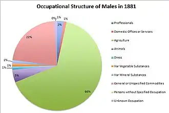 The graph of male occupation structure in 1881, shows that 66% of males are employed in agricultural services, 22% in domestic office or services and 5% are working with animals. This shows that Ringshall was quite primary product dependant, as a large percentage of the population worked in this sector.[6]