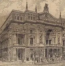 The Ringtheater was built between 1872 and 1874 by Heinrich von Förster, following plans by Emil Ritter. It opened on January 17, 1874, under the direction of Albin Swoboda, Sr. as an 'Opéra Comique', antithetical to the "seriousness" of the Vienna State Opera, then called the Court Opera ('Hofoper'). However, in September 1878, the focus was shifted to spoken plays, German and Italian opera and variety, and the name was changed to the "Ringtheater".