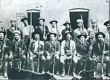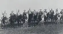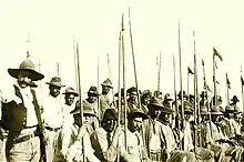 Honório Lemes ridiculed Juarez Távora for being a bad horse rider.[58] War on horseback, still important in a time of incipient motorization, was well understood by the Rio Grande do Sul irregulars.[54] Both sides appropriated all the horses they found on the way, increasing their mobility and denying the enemy mounts.[59] The clothing was typically gaucho in style, distinguished by the red scarves and ribbons, symbols of the revolution.[60] Many carried obsolete weapons: garruchas, shotguns and Comblain and Chassepot rifles. The Winchester rifle, more recent and widespread in rural areas, had less range and power.[61] This diversity of weapons made remuniciation very difficult.[62]