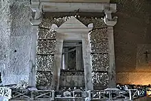 One of the most peculiar traits of Rione della Sanità is a unique cult and ritual that takes place in the ossuary of the Fontanelle cemetery. The cult dates back to the 17th Century and involves the ritual burning of candles dedicated to the so-called "pezzentelle" ("little wretches"), i.e., the soul of the "nameless dead" whose bones are preserved in the ossuary. More specifically, Neapolitan families traditionally "choose" one specific skull from the ossuary and take care of it (cleaning it up, repositioning it properly in the ossuary, and so on), with the intent that the "adopted" nameless soul will repay those attentions with good luck and blessings. While the cult has a general Catholic frame (as the "pezzentelle" are usually identified as Purgatory souls), many of its elements are rather pagan in nature, so that it can be classified as a syncretic cult.[2]