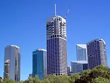 Riparian Plaza is a 53-storey skyscraper located in the central business district of Brisbane, Queensland, Australia. The building stands at 250 m (820 ft) in height to its communications spire and 200 m (660 ft) to its roof. It was Brisbane's tallest building until it was surpassed by Aurora in 2006 and is a particularly iconic building on the Brisbane skyline. It is a mixed use building, with 11 car park levels from the ground up, 25 commercial levels, and 12 residential levels originally housing 50 penthouse apartments.