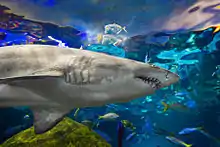 - The Dangerous Lagoon is an underwater tunnel with a moving conveyor belt, which is the aquarium's largest tank. Some of the featured animals in this exhibit include sand tiger shark, sandbar shark, roughtail stingray, longcomb sawfish, green sea turtles.[1]
