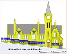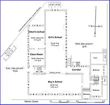 The school building was financed by Ripley and run by the non-denominational British and Foreign School Society It was designed by Andrews Son and Pepper in a gothic revivalist style. The halls and classrooms were on a single level with service rooms in a basement. Internally the ground floor (total area 4,192 sq. ft.) was mainly taken up by two large halls of double height. The south hall of 1600 sq. ft. accommodated the girls primary school and the northern hall of 1300 sq. ft. accommodated the boys. Two smaller classrooms accommodated the infants.[23] Later photographic evidence suggests that the class room block as built varied from the plan. Instead of two unequally sized classrooms with an entrance lobby to the north there were two equally sized rooms separated by a centrally placed entrance lobby. The entrance door was beneath a gabled semi-dormer with a round window in the gable – very similar to the gables of the north façade.