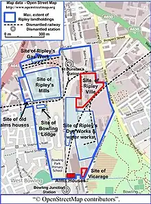 By the 1860s Ripley was managing partner of the Bowling Dye works, founded by his grandfather in 1808. In 1822 the dye works had relocated from West Bowling to a site in Spring Wood next to the Spring Wood Colliery pumping shaft – which supplied the works with steam and water. The works employed 18 men and boys. From 1835 as the junior partner Henry was "regarded as the boss of the dyehouse".[3] He built up the business to be the biggest dye works in Yorkshire. From the Bowling Iron Works he purchased the freehold of the dye works and about 100 acres of land surrounding it and subsequently built up the landholding to about 130 acres.[4] The landholding added to the available water supply – "The whole of the water required for the supply of the works is an available source of 1,250,000 gallons per day". To the dye works income he had added income from several mills[5] rented out on a "room and power" basis, from a water works (supplying 600,000 gallons per day) and a gas works. He was recognised as one of Bradford's "big four" industrialists alongside Titus Salt, Samuel Lister and Isaac Holden. As a councillor, JP and public figure Ripley was deeply involved in the debates which engaged the recently (1847) incorporated borough council and its citizens.