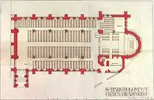 Press articles covering the dedication[26] and consecration[27] ceremonies provide a detailed account of the architecture. The style was a simplified Early English. External masonry was Bradford stone and its roof was made of green Westmoreland slate. The churchyard had low stone walls with decorative wrought iron railings and gates. Internally the church walls were of pressed brick with moulded capitals to the columns and arches of polychrome brick – reportedly, "a very cheerful effect". Its 740 sittings were provided free. The church occupied the dominant site in Ripley Ville and with the west gable apex 70 ft above street level the external appearance was very impressive. The architectural carving was executed by Charles Mawer.[28]