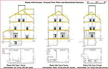 Ripley was not convinced by the arguments of the speculative builders. In November 1865 he issued a prospectus for the construction of 300 "Working-men's dwellings" on his own land.[11] They were four-bedroom through houses with rear yards and front gardens and equipped with an internal WC. The houses were intended for sale to small landlords and owner occupiers with a provision for rental purchase and some renting. The Bradford firm Andrews and Pepper were appointed architects. The specification for the Ripley Ville houses was influenced by the proponents of model housing, such as J.Hole[12] and Godwin, editor of "The Builder" and the practices of contemporary model builders in the West Riding. By the mid 1860s the views of the improvers had moved on from the provision of basic accommodation to considerations of lighting, ventilation, heating, storage, privacy and open space.[13] The design of the Ripley Ville houses incorporated these enhanced standards, and in several respects exceeded them.