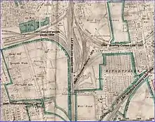 In 1896 the Midland Railway obtained an act of Parliament authorising it to build a through railway from its main line at Royston to connect with its existing tracks at Bradford Foster Square.[42] The proposed line of railway passed under Ripley Ville. The Midland's cash offer of £6,000 for the purchase of Ripley property was unacceptable to the Ripley Trust who also felt that there was a direct threat to the soft water supply to the dye works. An Arbitration hearing in 1900[43] awarded the Ripley Trust £14,000 for 3 acres of land in Ripley Ville. This included 4 terraces of houses and a strip of land across Ladywell Fields. After another Act of Parliament in 1912 and several changes of plan the Midland Railway decided, in the changed economic circumstances after the Great War, to abandon the scheme. Bradford Corporation (who were wholly in favour of the scheme and deeply regretted its abandonment) agreed to buy all the land acquired by the Midland. This included, in addition to much land in the centre of the city, the four terraces of houses in Ripley Ville and Ladywell fields. Ladywell Fields were designated as a public park. Management of the four terraces of houses passed to the Borough's housing department.