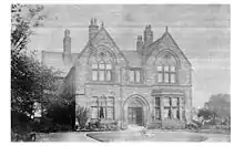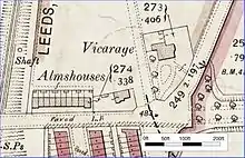 The first vicar, Mr Rice, lived in a rented house at 22 Edmund Street which still exists. The parish, under the leadership of Ripley, decided a more permanent arrangement was needed. Ripley donated the site (0.406 acres) on New Cross Street about half a mile south of the church. The architects were T.H and F Healy who placed an invitation to tender in the Bradford Observer on 26 February 1874. The vicarage was completed in 1875, costing £2,050. The Ecclesiastical Commissioners provided £1,300 and the parish raised £750 from benefactions.[29] Contemporary press articles describe it as "on the scale of a "gentleman's residence" and as having "both day and night nurseries".[30] No plans survive but from the large scale Ordnance Survey map its ground area can be measured as 2036 sq.ft compared with the 505 sq.ft. ground area of a type 1 Ripley Ville house.