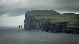 Risin og Kellingin (Risin and Kellingin) are two sea stacks just off the northern coast of the island of Eysturoy in the Faroe Islands close to the town of Eiði. The name Risin og Kellingin means The Giant and the Witch (or Hag) and relates to an old legend about their origins. The Giant (Risin) is the 71m stack further from the coast, and the witch (Kellingin) is the 68m pointed stack nearer land, standing with her legs apart.