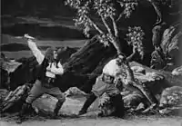 A Spanish dancer, in front of an inn in the Spanish mountains, is courted by a smuggler, who asks her to marry him. She agrees. Later, in the dancer's room, another man enters and declares his love for her. The smuggler, entering unnoticed, hears the declaration of love, and a violent argument breaks out between the two rivals for the dancer's affection. The suitors travel to a remote spot in the mountains and fight to the death; the smuggler wins the fight when the other suitor falls over a precipice. Returning to the dancer's room, the smuggler comes to meet his beloved, but the dancer refuses him when she finds out he killed his rival. The smuggler stabs himself in despair. The dancer, running to his corpse, touches his hands, and is repulsed to find them covered with blood.[2]