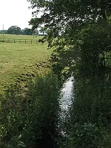 Historical maps[6] show the source of the river to be the lowland field drainage system to the northeast of Brookhouse Green.[7] From here, the river heads north past the hamlet of Illidge Green[8] and then northwest via Brereton Hall, where a weir and boathouse were created to the west of Saint Oswald's Church. The river flows northwest towards Parkmill Farm, where again a weir was constructed to form Brereton Pool. It then heads towards Holmes Chapel before turning west and passing under London Road (A50) at Alum Bridge. The river continues this westward course, passing under the M6 and Poolford Lane near Cinderhill[9] and then Brereton Lane, north of Dockbank Farm at Sproston. The river continues its westward journey via Fender Wood,[10] winding its way north of Kinderton Lodge towards Middlewich, where it is joined by Sanderson's Brook southeast of the town, near Brooks Lane. It then heads northwest on the right-hand side of the Trent and Mersey Canal until it joins the River Dane at the northwest corner of Harbutt's Field.