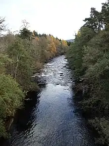 The River Dulnain (Gaelic: Tuilnean / Abhainn Tuilnein) is a major left bank tributary of the River Spey in northeast Scotland. It rises in the eastern part of the Monadhliath Mountains (57°09′06″N 4°07′44″W / 57.1516°N 4.1288°W) and flows in a generally northeastward direction through uninhabited country to Sluggan, where it is crossed by Sluggan Bridge, constructed by General Wade to carry a military road. (The route now forms a part of Route 7 of the National Cycle Network.) Turning more easterly, the Dulnain passes beneath the modern A9 road which bypasses Carrbridge, the mainline railway and, in Carrbridge itself, the Carrbridge Packhorse Bridge that gives the village its name and the bridge carrying the B9153 road (former A9). The final section flowing east-northeast to the village of Dulnain Bridge is accompanied by the A938 road. The river empties into the Spey (57°17′37″N 3°39′14″W / 57.2936°N 3.6538°W) after passing beneath the A95 road and the disused bridge of the former Strathspey railway.[1]