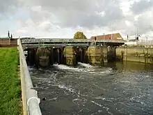 The main components of the scheme were a rising sector gate, 85 feet (26 m) wide by 36 feet (11 m) high, which can be raised to prevent tidal surges moving further upstream, and a vertical sector gate, 59 feet (18 m) wide by 38 feet (11.6 m) high, to control the entrance to the wet dock. The rising sector gate weighs 362 tonnes and is moved by two 55-tonne hydraulic rams. The scheme also included a control building for the barrier, higher flood defence walls along the river, including landscaping of the right bank, and the placing of matting on the bed of the river either side of the barrier, to prevent scouring undermining the structure. The construction of the barrier was innovative, as it is quite different to the Thames Barrier in its design, and the only other similar structure, that at Ipswich on the River Orwell, is some 30 per cent smaller, and had not been commissioned at the time the Boston Barrier project began.[1] Work began on the project in 2018,[3] and the sector gate, which was manufactured in Holland, was delivered in November 2019. The gate was operational by December 2020, and the completed scheme offers better flood protection to over 13,000 homes and businesses. The entrance to the wet dock was widened from 52 feet (16 m) to 59 feet (18 m), with the existing timber V-gates being replaced by a single pair of vertical sector gates.[4]