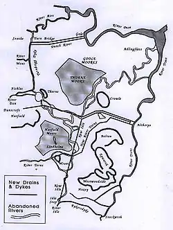 In 1626, the Dutch drainage engineer Cornelius Vermuyden was appointed by King Charles I to drain Hatfield Chase. Vermuyden brought over a number of Walloon partners, known as 'The Participants', who took shares and performed the drainage work, which was completed two years later.[13] The Idle's northern course was blocked by a dam constructed at a place which subsequently became known as 'Idle Stop', its waters diverted along the Bycarrs Dyke. The ancient channel was straightened, made deeper, and embanked.[14]