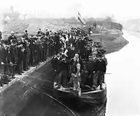 The stretch from Jude's Ferry to Isleham includes several pill-boxes, which were constructed during World War II to defend against invasion.[6] Above the start of the lock cut is a memorial to the famous Baptist preacher Charles Spurgeon, who was baptised in the river on 3 May 1850. The site, where a chain ferry once crossed the river, and another near the weir were used for public baptisms until 1970. Isleham itself has three pubs, all dating from the 17th century, some shops and a large marina. There was an outbreak of cholera here in the 1850s, when over 500 people were "living in hollows" as a result of poverty which affected many fenland villages. In medieval times, Isleham was an important port with three quays. Remains of a Roman villa and over 6,000 Bronze-Age artefacts, which are now in the Moyse's Hall Museum at Bury St Edmunds, indicate that it has been a centre of occupation since antiquity.[7]