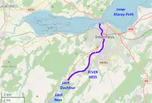 The River Ness (Scottish Gaelic: Abhainn Nis) is a river in Highland, Scotland, UK. It flows from Loch Dochfour,[1][2] at the northern end of Loch Ness, north-east to the mouth of the Beauly Firth at Inverness, a distance of about 6 miles (10 kilometres),[3] with a fall in height of about 16 metres (52 feet). The river is the origin of the name of Inverness which is from Scottish Gaelic: Inbhir Nis, meaning "Mouth of the Ness".