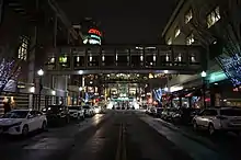 The original River Park Square was opened in 1974.[1] In 1978, an expansion added a 55,000 square-foot enclosed second level and two skywalks connecting the mall to the JCPenney and Nordstrom stores.[2] When completed, the shopping center contained 800,000 square-feet of retail space with The Crescent, JCPenney, and Nordstrom as anchor stores.[2] In February 1984, a new skywalk was constructed to connect the center to The Bon Marché, which was located east of the complex.[3] The addition of the skywalk added 20,000 square-foot of retail space to the center.[3]