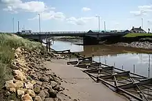 Plans to re-route the outfall along a new channel which would meet the River Witham at The Scalp, near Boston, were authorised in 1794, but the money could not be raised at the time, due to the financial crisis caused by the French Wars.[61] Grundy's shorter channel had been finished by 1810, improving both drainage and navigation. James Walker reported in 1835 on further improvements, making the recommendation that the river below Spalding should be constrained between high banks, so that the scouring action of the water would dredge its own channel. Rather than excavating, which he estimated would cost £70,000, he suggested using fascines made of thorn branches, around which silt would be deposited. Such a scheme would only cost £13,000, and the work went on for many years.[62] The effects of the embankments had resulted in the bed of the river below Fosdyke being around 7 feet (2.1 m) lower by 1845.[63] In 1867, the River Welland Outfall Act enabled the trustees to raise money to repair the walls where the tide had washed away some of the fill behind the fascines. A dredger was employed between 1889 and 1890, which had been invented by a Mr Harrison, the superintendent of works.[62]
