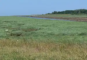 After passing Fosdyke Bridge the river passes into Moulton Marsh where it is joined by the Holbeach River, the river from this point then enters a area of extensive salt marshes with estuary like features which make up what is known as “The Fosdyke Wash” at the very south-western edge of The Wash where the salt marshes becomes indistinguishable from the sea and from here the river quickly loses the traditional characteristics of being a river as the main river banks move away from the river itself at this point to become the main sea embankments and this leaves the river without a distinguishable mouth as it merely becomes a deep tidal channel known as the “Welland Outfall”, where it finally flows into The Wash itself in a area that’s known as the “Boston Deeps” at Tabs Head where it also meets the mouth of The Heaven close to the RSPB nature reserve at Frampton Marsh.[1][9]