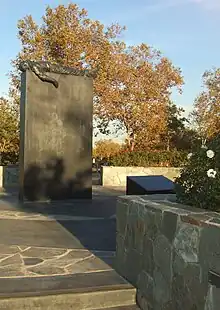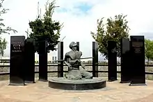The Prisoner of War/Missing in Action Memorial was designated a National Memorial by the U.S. Congress on December 10, 2004[4] and dedicated September 16, 2005. A bronze statue, sculpted by Vietnam veteran Lewis Lee Millett Jr. is the image of an American serviceman on his knees and bound by his captors. The statue is surrounded by black marble pillars, representing imprisonment.