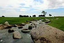 The dramatic, meandering landscape features a central boulevard with memorial circles, lakes, indigenous-styled committal shelters, and a memorial amphitheater.