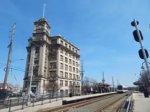 Riverside station with the former Philadelphia Watch Case Company Building in the background