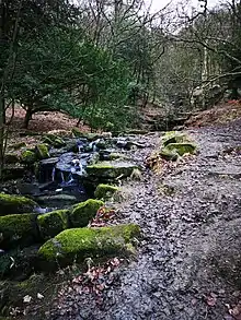 Prior to the reservoirs the valley of Rivington was mostly farmland, with little natural woodland, a small village with stone cottages, and a pub. The valley had a stream flowing through, crossed by packhorse bridges. Lester Mill was located near the upper reservoir and there was a mill utilising water power once located where now stands the village hall. The mill was used as a smithy in the 19th to early 20th century.[31] A further water mill was located at Rivington Hall. In the 19th century, farming was reduced with the construction of reservoirs.[31] The area of the Rivington Unitarian Chapel is named Mill Hill on the 1848 OS map and extended to Croft Bridge, crossing Hall Brook. The Victorian 'School Houses' became known as Mill Hill cottages.[13] Mill Dam wood is at the rear of the Vicarage - a pond existed there prior to the reservoir construction. On the watercourse is a ruin that could be a former water wheel house.[32][33]