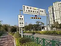 Road signs in Macau are regulated in the Regulamento do Trânsito Rodoviário (Chinese: 道路交通規章; pinyin: Dào Lù Jiāo Tōng Guī Zhāng) and standardised by the Secretary for Transport and Public Works.[1] Due to being a former Portuguese territory, the road signage in Macau is similar to road signs used in Portugal until 1998, with the addition of traditional Chinese characters and some signs reversed to reflect driving on the left. After the transfer of sovereignty over Macau in 1999, the old style of Portuguese road signs was retained and still used. Road signs conform to the general pattern of those as set out in the Vienna Convention on Road Signs and Signals, although Macau is not a signatory to it, but Portugal is.[2] Macau drives on the left.
