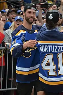 By January 2019, the Blues were in last place around the entire league resulting in a coaching and goaltender change.[72] The changes proved to be successful as Bortuzzo ended the regular season playing in 59 regular-season games and accumulating 10 points as the team qualified for the 2019 Stanley Cup playoffs.[73] The Blues beat the Winnipeg Jets and Dallas Stars to qualify for the Western Conference Final against the San Jose Sharks. After losing in Game 1 of the Finals, the Blues and Sharks returned for Game 2 at the SAP Center, where Bortuzzo scored the game-winning goal at 16:34 of the second period in an eventual 4–2 win.[74] The Blues ended up winning the series and met with the Boston Bruins in the 2019 Stanley Cup Finals. Bortuzzo and the Blues beat the Bruins in seven games to win their first Stanley Cup in franchise history,[75] and become the first SIJHL alumni to do so.[76] Although he was scratched for the final game of the series,[77] Bortuzzo was rewarded for his efforts with a Day with the Cup.[76]