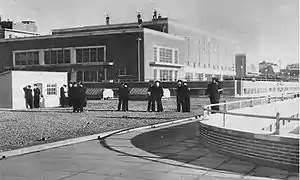 Clark and his family lived for almost 50 years at a house in Surrey, the former home of horticulturist Gertrude Jekyll, that had been designed by Edwin Lutyens and which Clark described as "the best investment I ever made".[2] Clark was a keen antiquarian, collecting old books and keeping a record of each one that he read.[1] He maintained an interest in sport as well as the opera, having acted as director of the English National Opera from 1983 to 1987.[1][3] He collected teddy bears, having more than 300 in total (including Falla), and was also interested in the life of Captain Cook, retracing one of his voyages himself.[2] Clark was vice-chairman of the Salisbury Cathedral spire appeal.[2] He was contacted in 1991 by Curetti, the Italian partisan who first helped him out of a tree in the war, and the pair visited each other regularly thereafter.[1] Clark died on 3 January 2013.[3]