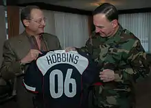 Robert Contiguglia (left), presents Gen. Tom Hobbins with a U.S. men's national team jersey at the Ramstein Air Base in Germany in 2006.