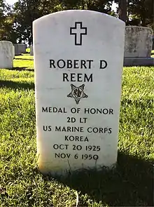 Second Lieutenant Robert Dale Reem (October 20, 1925 – November 6, 1950) was a United States Marine Corps officer who posthumously received the United States' highest military decoration — the Medal of Honor — for his heroic actions during the advance to the Chosin Reservoir in the Korean War; he threw himself on an enemy grenade, sacrificing his life to save his men.