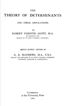 - The theory of determinants and their applications (2nd ed., revised by George Ballard Mathews), Cambridge University Press, 1904.