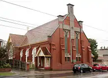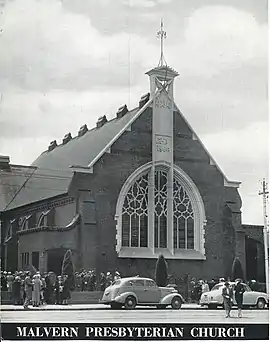 Built in 1928 as St Andrew's Presbyterian, Oakleigh[14] and designed by Haddon in cooperation with his business partner, William Henderson, this building confidently sits the corner of Drummond and Palmer Streets,[15] Oakleigh. Short and squat with an octagonal castellated tower, the windows, brickwork and restrained adornment look decidedly "Haddonian" as Professor Miles Lewis AM of Melbourne University states in a 1991 National Trust of Victoria publication.[16] While Professor Lewis goes on to describe the cantilevered wrought iron lamp over the entrance and a blind oculus in the western wall, he is clearly not a fan and calls the spire "risible". In Miles Lewis' words, an overall mannered and clumsy form. However, with the benefit of two and a half decades, tastes have moved on from Lewis' time to reassess this era of building. Similar to Malvern and St Stephen's, Caulfield, the Oakleigh church enjoys a cement gable treatment enhancing the focus on the apex, and proudly displaying the year of construction. The overall impression is coherent and pleasing in its suburban scale. Recent sympathetic additions have enhanced the facilities of this attractive campus but the Haddon building still sits the corner site well. Its presence shows a transition to the heavier, monolithic presence of the moderne and Art Deco of the 1920-30s. In this sense, Haddon carries forward his Arts and Crafts ideals but has left the gothic well behind and synthesized for the new architecture of the inter-war period.