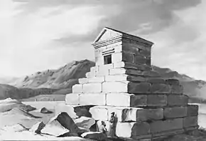 Porter had returned to England before the appearance of this book, and on 2 April 1813 he was knighted by the Prince Regent. He was soon abroad again, and in August 1817 he left from St Petersburg on a long journey which took him through the Caucasus to Tehran, and then southwards via Isfahan to the site of the ancient Persepolis, where he made drawings and transcribed a number of cuneiform inscriptions. After a stay at Shiraz, he returned to Isfahan, and proceeded to Ecbatana and Baghdad, and then, following the route of Xenophon's Katabasis, to Scutari.[1] He was the first person to locate the mausoleum of Cyrus the Great in Pasargadae near Shiraz.[2] He published an account of his journey in Travels in Georgia, Persia, Armenia, Ancient Babylonia, 1817–1820. At Tehran, he had an audience with the Persian monarch Fath-Ali Shah Qajar, whose portrait he drew, and from whom in 1819 he received the Order of the Lion and the Sun.[1]
