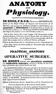 In 1810, he joined medical classes at the University of Edinburgh. He soon became interested in transcendentalism[5] and the work of Xavier Bichat.[6] He was twice president of the Royal Physical Society, an undergraduate club to which he presented papers on hydrophobia and nosology.[7] The final recorded event of his university years was his just failing the anatomy examination. Knox joined the "extramural" anatomy class of the famous John Barclay. Barclay was an anatomist of the highest distinction, and perhaps the greatest anatomical teacher in Britain at that time. Redoubling his efforts, Knox passed competently the second time around.