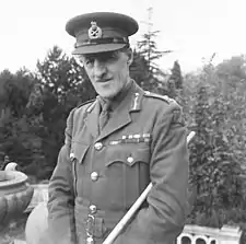 Still serving in Palestine upon the outbreak of World War II, the battalion moved, in January 1940, to Brigadier Cyril Lomax's 16th Brigade. In April he returned to the United Kingdom and, on 24 April, was promoted to the acting rank of brigadier, and took command of the 160th Infantry Brigade, a Territorial Army (TA) formation then serving in Northern Ireland with its parent unit, the 53rd (Welsh) Infantry Division, then commanded by Major General Bevil Wilson. On 12 September 1942, promoted to acting major general,[16] he became the GOC of the 53rd Division, succeeding Major General Gerard Bucknall.[4] His rank of major general was made temporary on 12 September 1943,[17] and permanent on 12 December 1944 (with seniority backdated to 3 February 1944)[18]