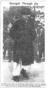 As head of the Labour Front, Ley invited Edward, Duke of Windsor, and Wallis, Duchess of Windsor, to conduct a tour of Germany in 1937, months after Edward had abdicated the British throne. Ley served as their host and their personal chaperone. During the visit, Ley's alcoholism was noticed, and at one point he crashed the Windsors' car into a gate.[16][17]