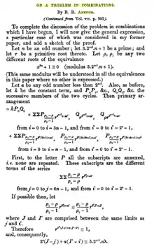 Robert Richard Anstice (1813–1853) was an English clergyman and mathematician who wrote two remarkable papers on combinatorics,[2] published the same year he died in the Cambridge and Dublin mathematical journal. He pioneered the use of primitive roots in this field, anticipating the work of Eugen Netto on Steiner's triplets.