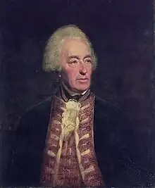 He was commander there for three years, flying his flag aboard the 84-gun HMS Royal William during the Spanish armament in 1790. During the crisis he received orders from the Admiralty to prepare the guardships for sea. He had them fitted and ready for manning within five days, and on being ordered to fit a further five ships for sea, completed the task in fourteen days.[19] His rapid response attracted French attention, who reported in their newspapers that 'British ships of war [have] sprung up complete like mushrooms.'[19] With the passing of the crisis Roddam struck his flag in 1792. With the outbreak of the French Revolutionary Wars Roddam received a promotion to admiral of the blue on 1 February 1793. He was promoted to admiral of the white on 12 April 1794, and admiral of the red on 9 November 1805.[1][19]