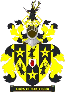 Upon three mascles interlaced fessways and in front as many tilting spears one in pale and two In saltire Or a stag’s head erased Sable attired Gold.