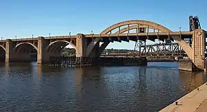 The Robert Street Bridge is a reinforced concrete multiple-arch bridge that spans the Mississippi River in downtown Saint Paul, Minnesota, United States. The bridge is notable for its complex design that was required to accommodate river traffic, the St. Paul Union Pacific Vertical-lift Rail Bridge crossing underneath it at an angle, and roadways on the downtown side of St. Paul. The bridge is also notable for a monumental reinforced concrete rainbow arch. The rainbow arch not only provides 62 feet of headroom above the river, but also provides a strong aesthetic focus. It was built in 1924–1926 by Fegles Construction Company, Ltd. and designed by Toltz, King & Day. The bridge was added to the National Register of Historic Places in 1989. The bridge as well as Robert Street itself are named after Captain Louis Roberts, a notable French Canadian river boat captain, businessman and early settler of Saint Paul, MN.